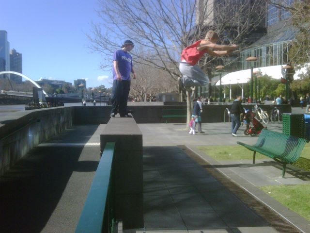 | Freerunners in Melbourne. The one in the red top is in mid air, jumping from the wall to the bench |